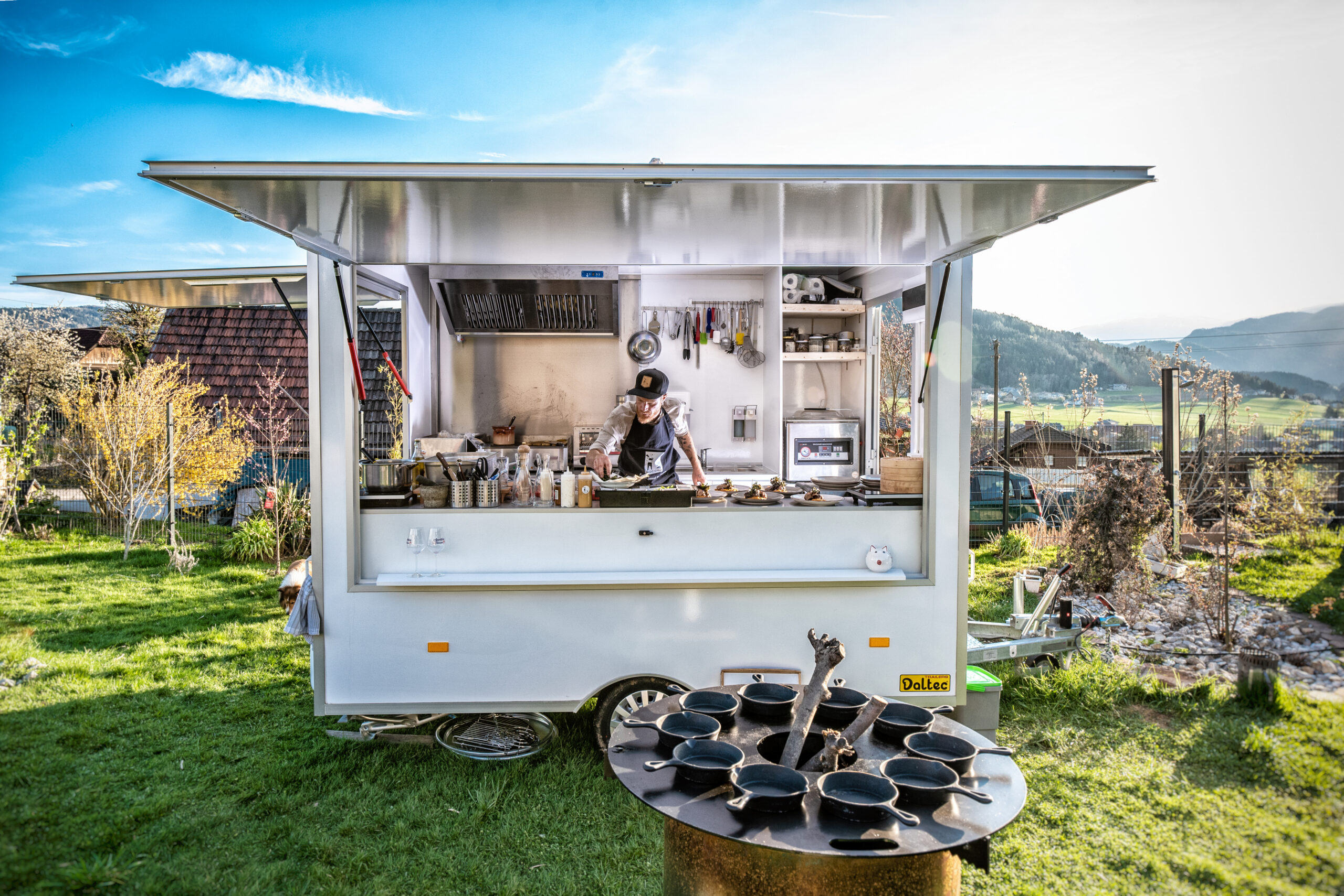 Die Idee hinter dem wandernden Restaurant ist nachhaltig und flexibel. Daniel Kraschl kommt mit seinem Food Truck auch in private Gärten: „Egal ob ein exklusives Mehr-Gänge-Menü oder die etwas andere Grillerei – alles ist möglich. Einzig Strom oder die Möglichkeit, Feuer vor Ort zu machen, müssen gegeben sein“, erklärt er. Alleine bewirten kann er bis zu 20 Personen.